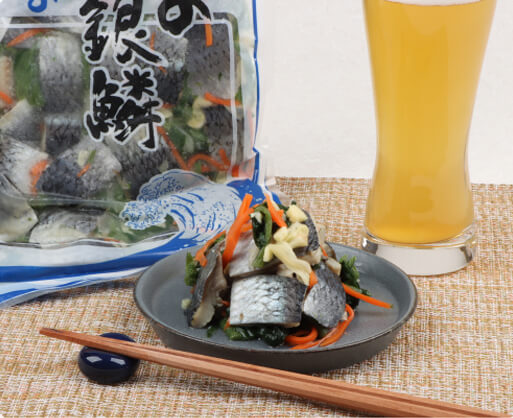 独自開発の甘酢液に漬け込んだ菜の花にしん漬け 北の銀鱗